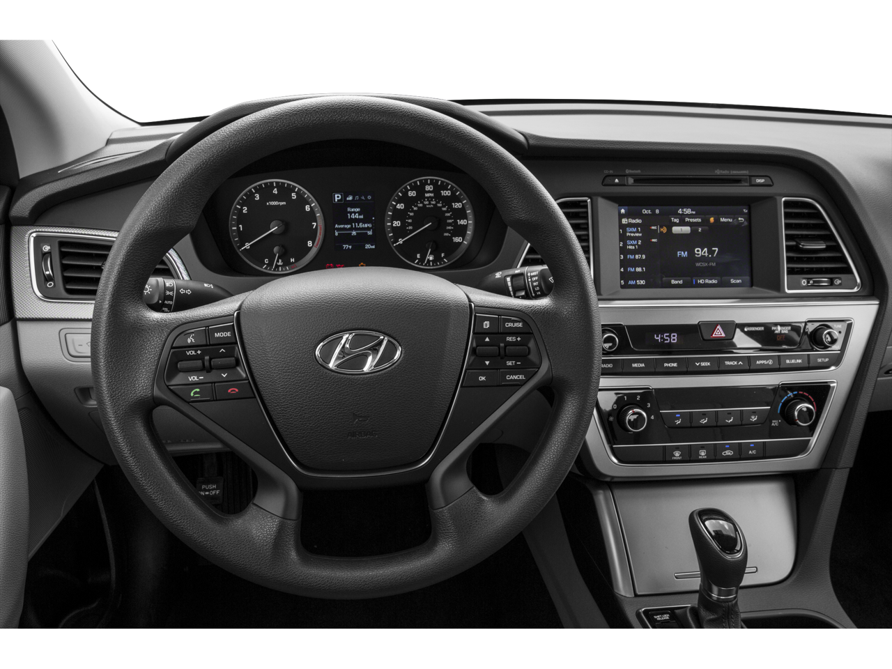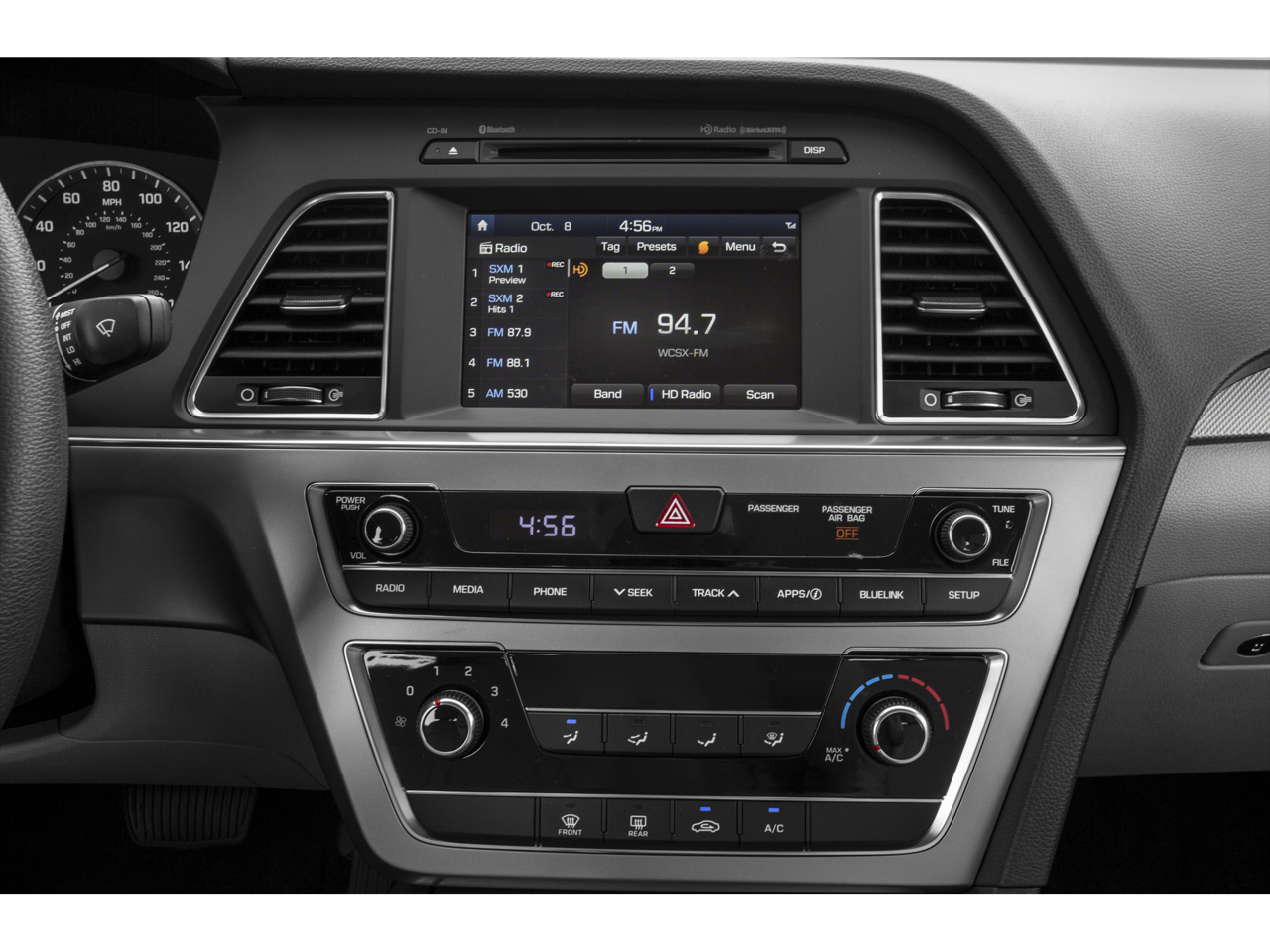 - OPTION GROUP 09 -inc: Popular Equipment Package 09 leatherette interior door panel inserts Hyundai Blue Link Telematics System (GEN 1) Rearview Backup Camera Automatic Headlight Control Front Bucket Seats w/Power Driver's Seat multi-adjustable bucket seatback pockets and 8-way power driver's seat w/2-way power lumbar support Radio: AM/FM/SiriusXM/CD/MP3 w/Color Touchscreen iPod/USB and auxiliary inputs 6 speakers (2 front-door-mounted 2 tweeters and 2 rear) and 5-inch color touchscreen