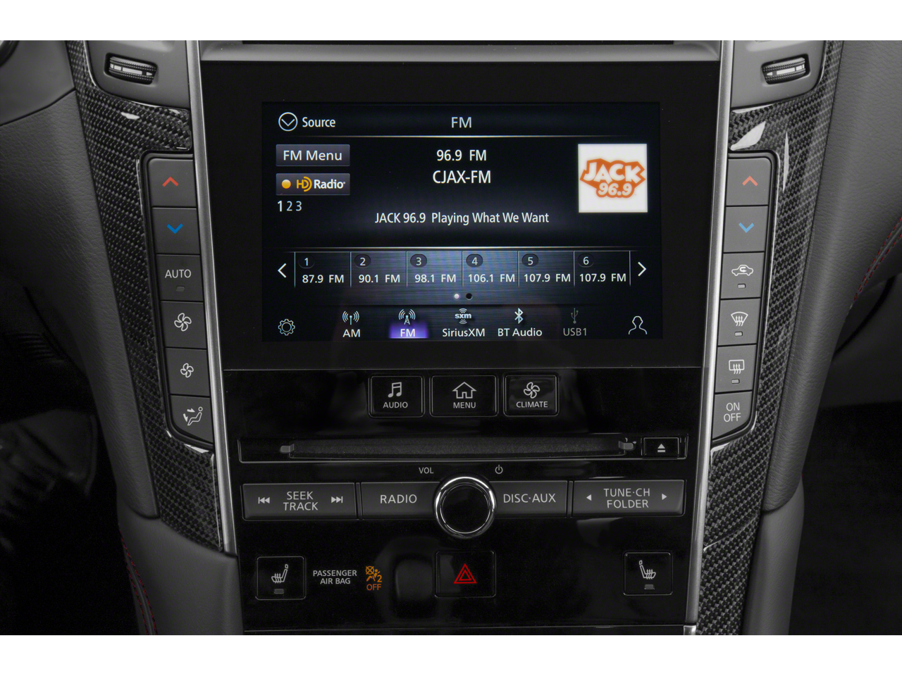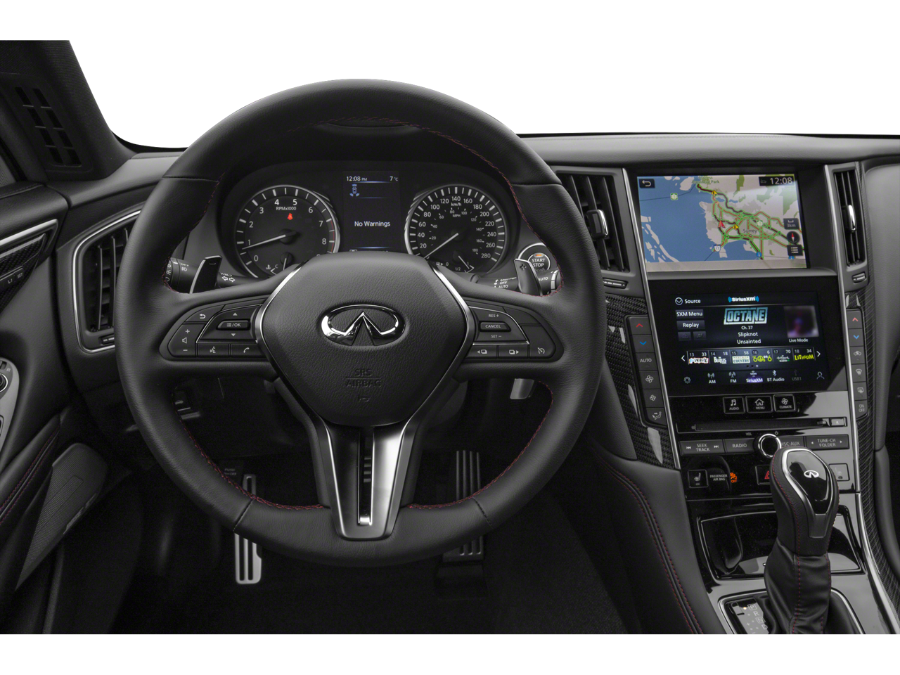 This vehicle comes equipped with: Performance Package (DISC) (Exhaust & Air Intake), 13 Speakers, 4-Wheel Disc Brakes, ABS brakes, Adaptive suspension, Air Conditioning, Alloy wheels, AM/FM radio: SiriusXM, Apple CarPlay/Android Auto, Auto High-beam Headlights, Auto tilt-away steering wheel, Auto-dimming door mirrors, Auto-dimming Rear-View mirror, Automatic temperature control, Blind Spot Warning, Brake assist, Bumpers: body-color, CD player, Compass, Delay-off headlights, Driver door bin, Driver vanity mirror, Dual front impact airbags, Dual front side impact airbags, Electronic Stability Control, Emergency communication system: INFINITI Connection, Exterior Welcome Lighting, Four wheel independent suspension, Front anti-roll bar, Front Bucket Seats, Front Center Armrest, Front dual zone A/C, Front fog lights, Front reading lights, Fully automatic headlights, Garage door transmitter: HomeLink, Heated door mirrors, Heated Front Bucket Seats, Heated front seats, Heated steering wheel, Illuminated entry, Illuminated Kick Plate, Leather Shift Knob, Leather steering wheel, Literature Kit, Low tire pressure warning, Memory seat, Navigation system: INFINITI InTouch Navigation, Occupant sensing airbag, Outside temperature display, Overhead airbag, Overhead console, Panic alarm, Passenger door bin, Passenger vanity mirror, Power door mirrors, Power driver seat, Power moonroof, Power passenger seat, Power steering, Power windows, Premium Paint, Radio data system, Radio: INFINITI InTouch w/AM/FM/HD/CD/Navigation, Rain sensing wipers, Rear anti-roll bar, Rear window defroster, Remote keyless entry, Security system, Semi-Aniline Leather-Appointed Seating Surfaces, Speed control, Speed-sensing steering, Speed-Sensitive Wipers, Steering wheel memory, Steering wheel mounted audio controls, Tachometer, Telescoping steering wheel, Tilt steering wheel, Traction control, Trip computer, Turn signal indicator mirrors, Variably intermittent wipers, and Wheels: 20 Staggered Aluminum-Alloy Sport.