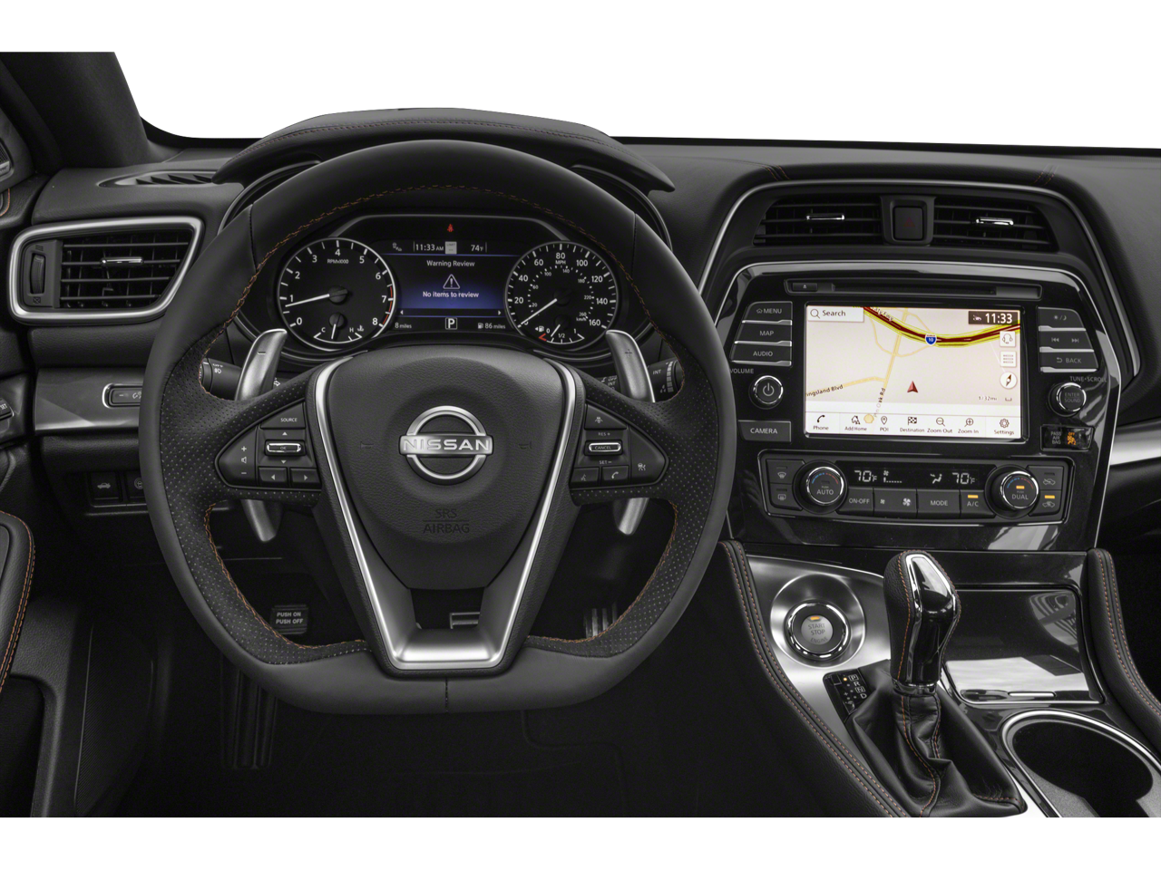 This vehicle comes equipped with : 11 Speakers, 4-Wheel Disc Brakes, ABS brakes, Air Conditioning, Alloy wheels, AM/FM radio: SiriusXM, Auto High-beam Headlights, Auto-dimming door mirrors, Auto-dimming Rear-View mirror, Automatic temperature control, Bag Hooks, Black Sport Spoiler, Blind Spot Warning, Body-Colored Splash Guards, Brake assist, Bumpers: body-color, CD player, Compass, Delay-off headlights, Driver door bin, Driver vanity mirror, Dual front impact airbags, Dual front side impact airbags, Electronic Stability Control, Emergency communication system: NissanConnect Services, Exterior Parking Camera Rear, First Aid Kit, Four wheel independent suspension, Front anti-roll bar, Front Bucket Seats, Front Center Armrest, Front dual zone A/C, Front fog lights, Front reading lights, Front Zero Gravity Climate-Controlled Seats, Fully automatic headlights, Garage door transmitter: HomeLink, Heated door mirrors, Heated front seats, Heated steering wheel, Illuminated entry, Knee airbag, Low tire pressure warning, Memory seat, Navigation system: Nissan Door to Door Connected Navigation, NissanConnect featuring Apple CarPlay and Android Auto, Occupant sensing airbag, Outside temperature display, Overhead airbag, Overhead console, Panic alarm, Passenger door bin, Passenger vanity mirror, Power door mirrors, Power driver seat, Power moonroof, Power passenger seat, Power steering, Power windows, Premium Ascot Leather-Appointed Seat Trim, Radio data system, Radio: AM/FM/CD Bose Audio System, Rear anti-roll bar, Rear reading lights, Rear seat center armrest, Rear side impact airbag, Rear window defroster, Remote keyless entry, Security system, Sliding Trunk Organizer Tray, Speed control, Speed-sensing steering, Speed-Sensitive Wipers, Split folding rear seat, Spoiler, Sport Floor Mats, Sport steering wheel, Steering wheel mounted audio controls, Tachometer, Telescoping steering wheel, Tilt steering wheel, Traction control, Trip computer, Trunk Mat, Trunk Net, Turn signal indicator mirrors, Variably intermittent wipers, Ventilated front seats, and Wheels: 19" Gloss Black Alloy w/Center Caps.