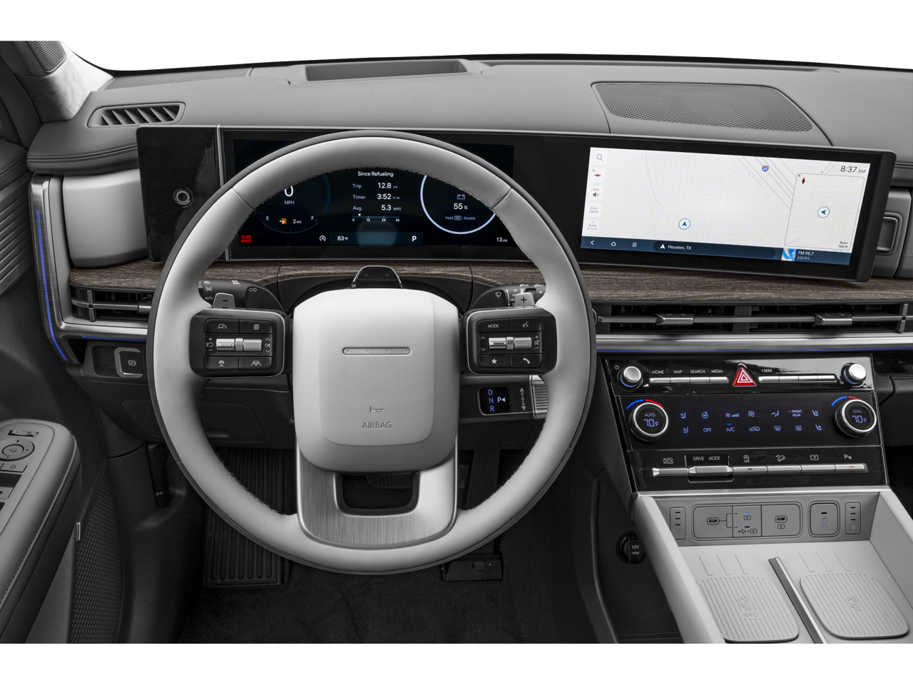 - Radio: AM/FM/HD Bose Premium Audio System -inc: 12 speakers including subwoofer, external amplifier, 12.3" wide touchscreen, Apple CarPlay and Android Auto, Bluetooth® hands-free w/wireless audio streaming, dynamic voice recognition, USB connectivity, SiriusXM, Blue Link+ connected car system, navigation system including traffic flow w/incident data via HD Radio (HERE) and rear seat quiet mode